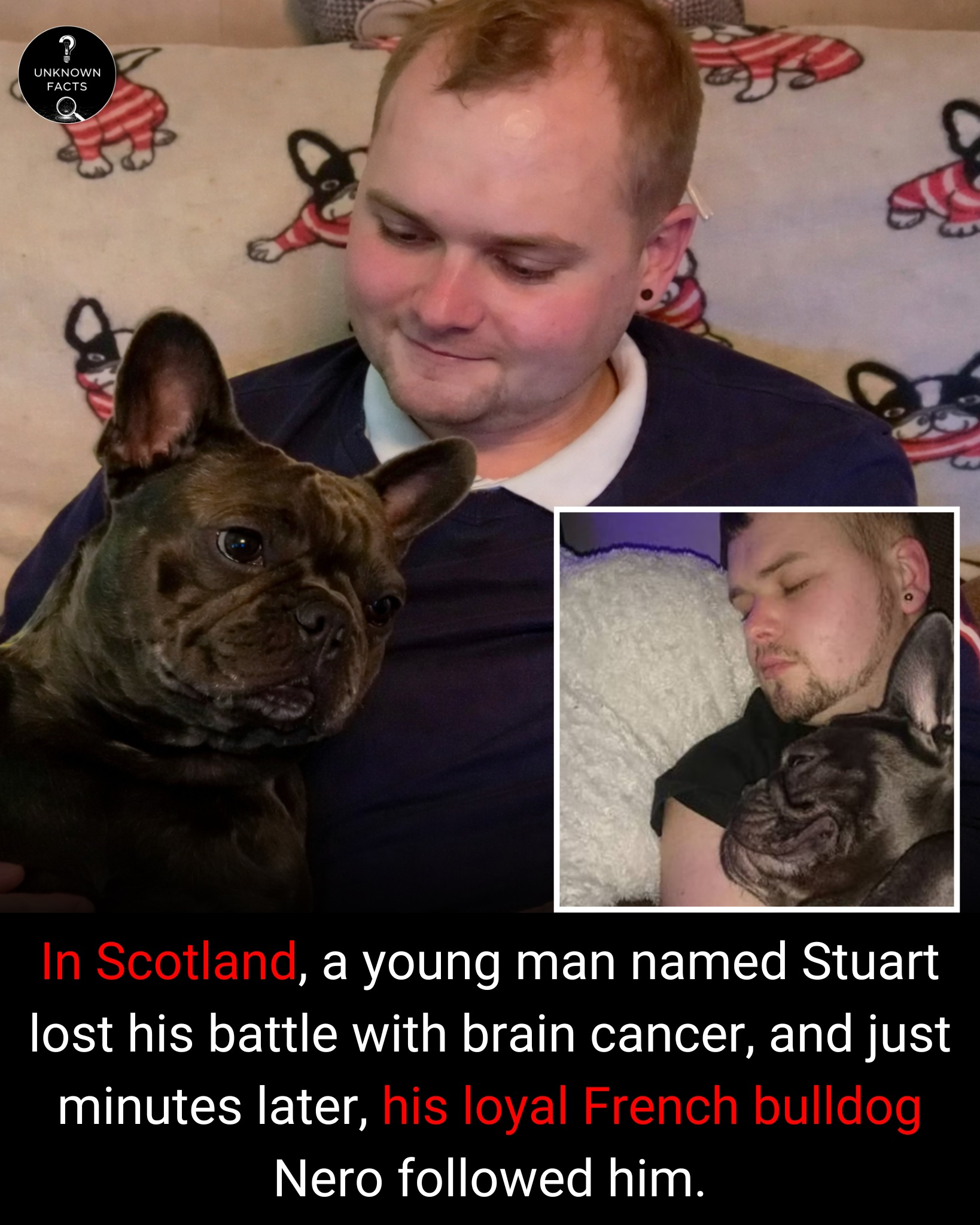 Stuart Hutchison, a young man from Alloa, lost his long battle with brain cancer after fighting the illness for several years. By his side throughout much of that journey was his loyal French bulldog, Nero, who rarely left him and became a constant source of comfort. On the day Stuart passed away, tragedy struck again. Just minutes later, Nero suddenly became unwell and was rushed to a veterinary clinic. Despite efforts to save him, the dog passed away shortly after. Veterinarians later found that Nero had suffered a serious spinal rupture, a condition that was fatal on its own. The timing of their deaths deeply touched people around the world, symbolizing the extraordinary connection between a devoted owner and his faithful dog. Their story remains a heartbreaking reminder of loyalty, love, and companionship. Continue reading…