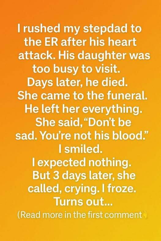 On a cold, heavy morning, I drove my stepdad to the ER. He’d had a heart attack at home, clutching his chest and insisting he was “fine,” even as sweat ran down his forehead. I didn’t argue. I got him in the car and stayed by his side through every test, every wire, every uneasy pause from the nurses. His daughter lived hours away and couldn’t make it in time. I never blamed her—sometimes distance is just the shape life takes.