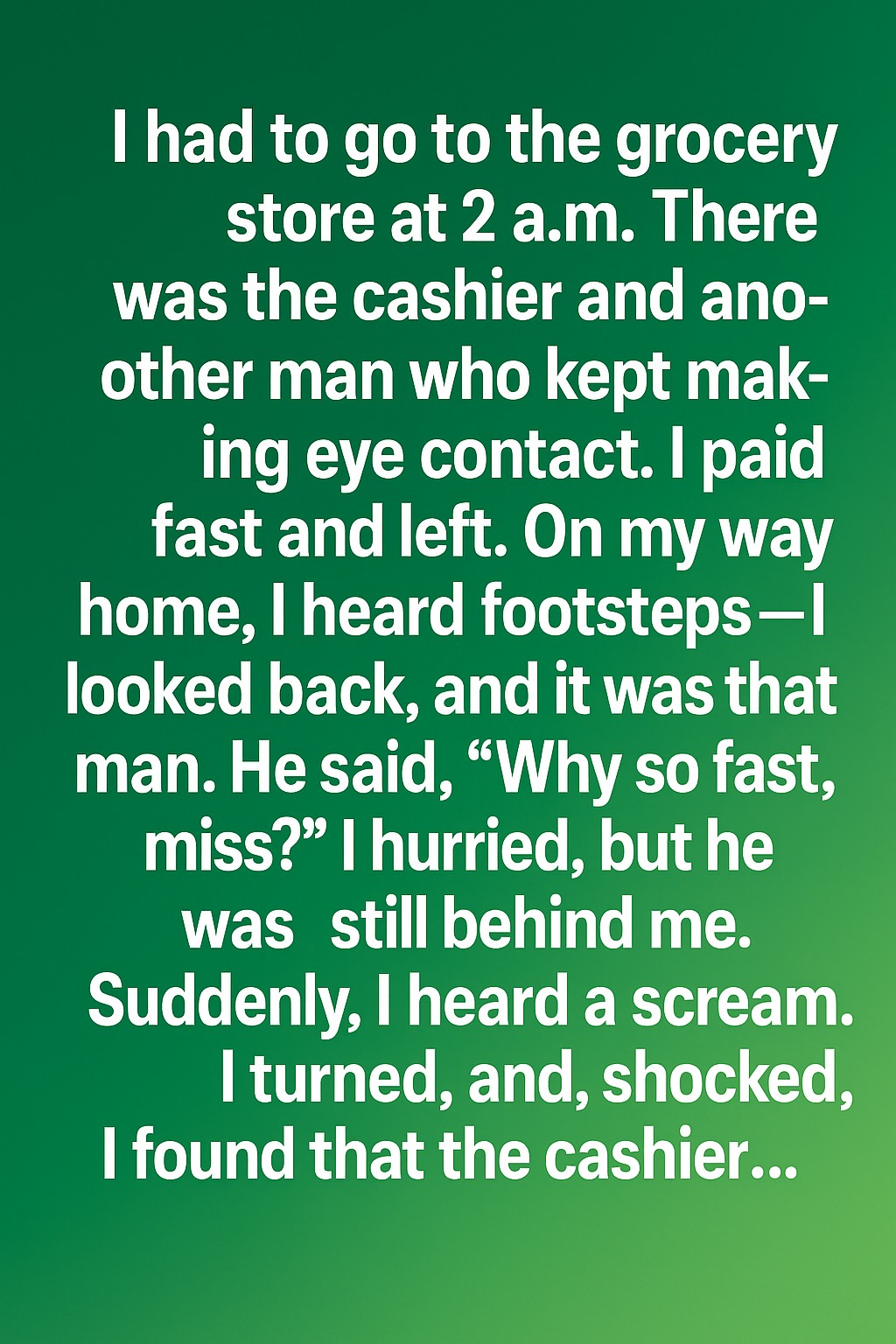 I had to go to the grocery store at 2 a.m. There was the cashier and another man who kept making eye contact. I paid fast and left. On my way home, I heard footsteps—I looked back, and it was that man. He said, “Why so fast, miss?” I hurried, but he was still behind me. Suddenly, I heard a scream. I turned, and, shocked, I found that the cashier……was running toward us, waving his arms and shouting. For a split second, I thought the situation had gone from uncomfortable to dangerous. My heart pounded as the cashier reached us, out of breath and pale. “Miss, wait!” he called out. “You left your wallet at the counter.” For a moment, everything froze—the streetlights humming above us, the cold air burning in my lungs, and the man beside me staring in confusion. Then the cashier looked at him and frowned. “Sir, I told you not to leave the store. Police are on their way. Please stay where you are.” My fear turned into bewilderment as the man raised his hands defensively, mumbling something about misunderstanding. Continue reading…