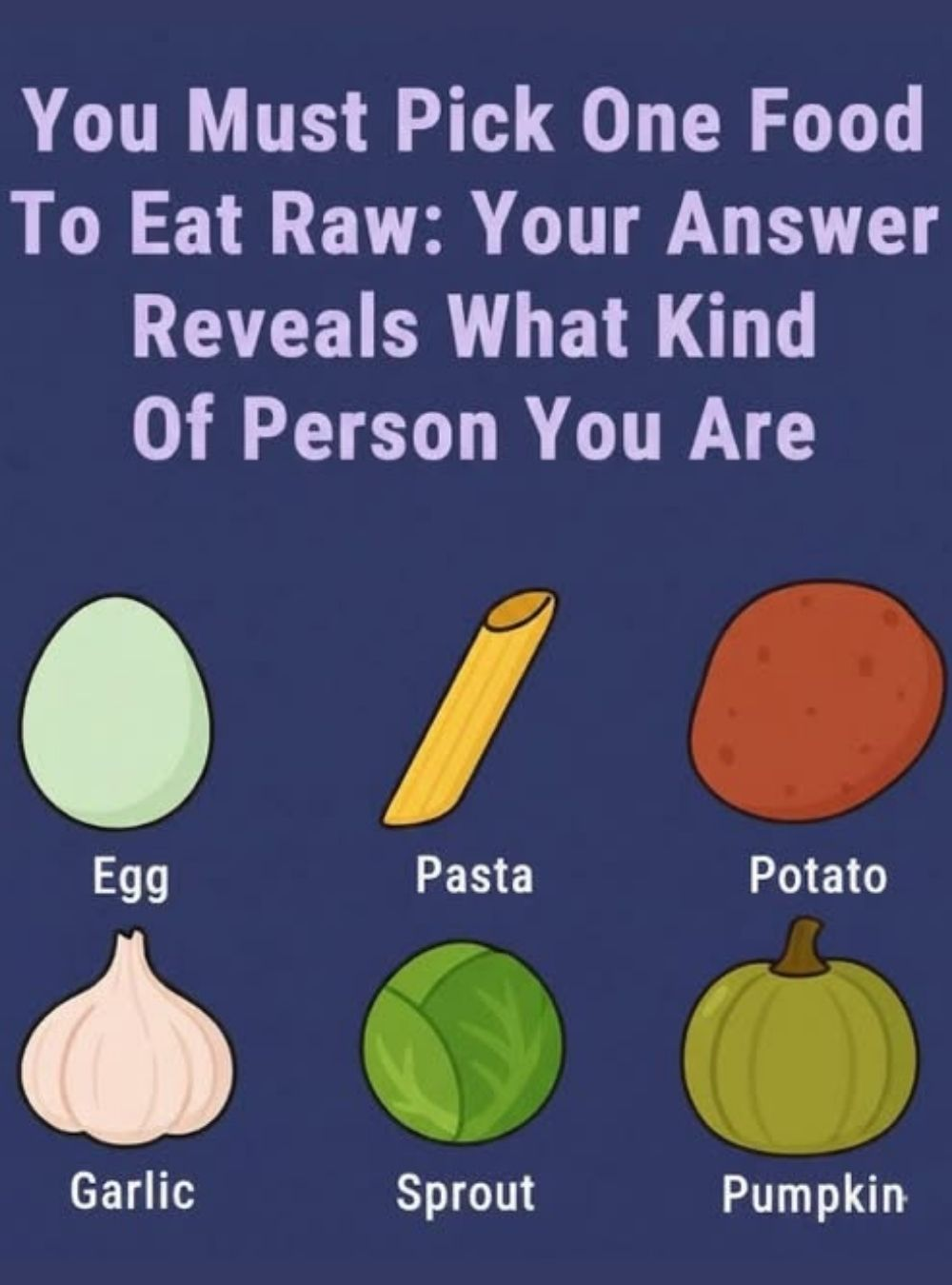 Small, unexpected choices can sometimes lead to simple moments of self-reflection. This playful “raw food personality” prompt invites you to choose one item—egg, pasta, potato, garlic, sprout, or pumpkin—and think about what that instinctive choice might suggest about your natural tendencies. It is not intended to be factual or analytical, but rather a fun way to spark conversation or personal curiosity. The idea is entirely imaginative, and none of the foods mentioned are meant to be consumed raw.