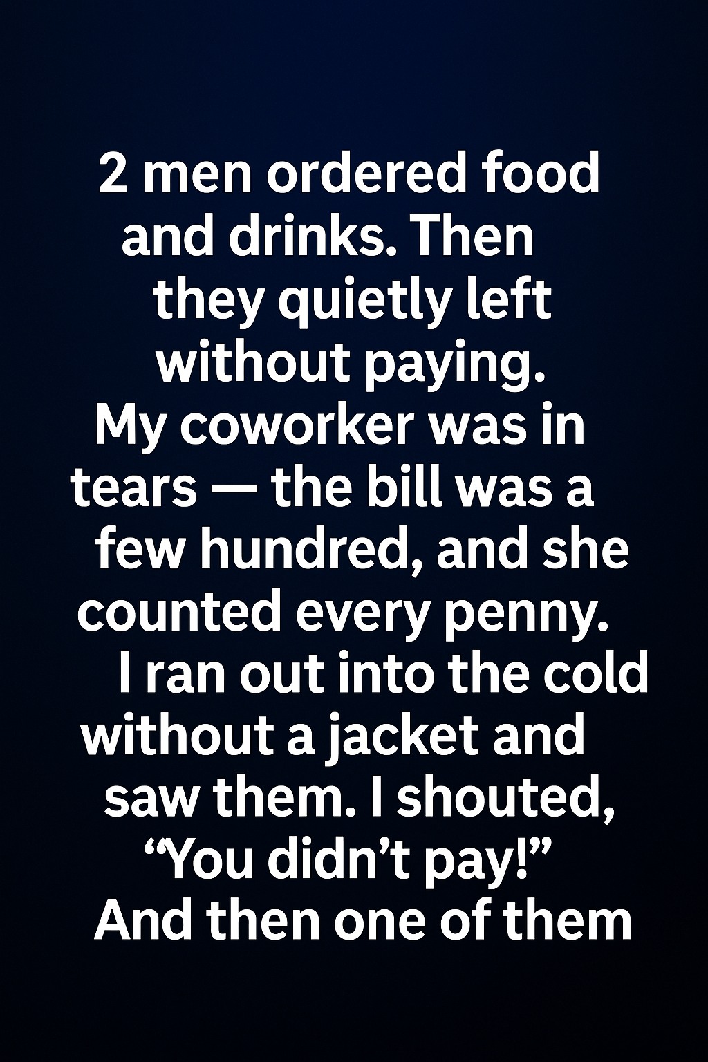 2 men ordered food and drinks. Then they quietly left without paying. My coworker was in tears — the bill was a few hundred, and she counted every penny. I ran out into the cold without a jacket and saw them. I shouted, “You didn’t pay!” And then one of them turned around with a look of confusion rather than guilt. For a split second, I wondered if I had misunderstood what happened. But when I explained that my coworker would be held responsible for the unpaid bill, their expressions softened. The taller man sighed and glanced at his friend before walking back toward me. “We thought it was already settled,” he said gently. He reached into his pocket and pulled out a folded receipt, realizing it belonged to a different café they had visited earlier. A genuine mistake—yet one that carried heavy consequences for someone who relied on every shift to get by. Continue reading…