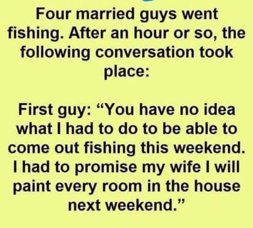 A group of four married men, eager for a day of relaxation and camaraderie, embarked on a fishing trip. As they cast their lines into the tranquil water, their conversation naturally drifted towards the “sacrifices” they had made to escape their domestic responsibilities for a few precious hours. Each man shared his tale of negotiation and compromise, painting a humorous picture of the delicate balance between marital bliss and personal desires.
