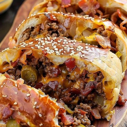 • Layer the Fillings: Evenly distribute the cooked ground beef over the condiments. Sprinkle the crumbled bacon and chopped pickles on top.