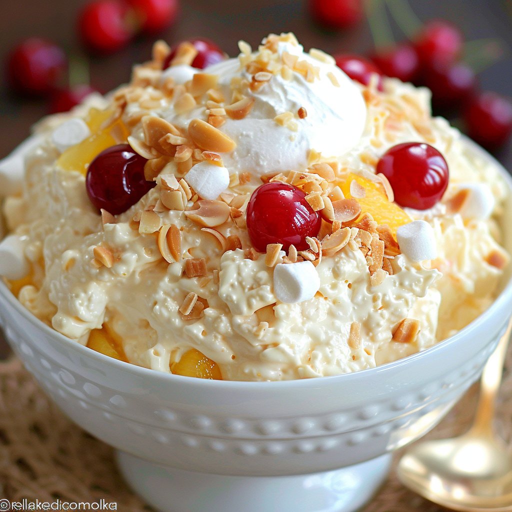 Chewy mini marshmallows, tangy maraschino cherries, and buttery toasted macadamia nuts get enrobed in that coconut-pineapple pudding cloud. A blanket of lush whipped topping seals the heavenly deal before the whole thing gets chilled into sweet, creamy submission.