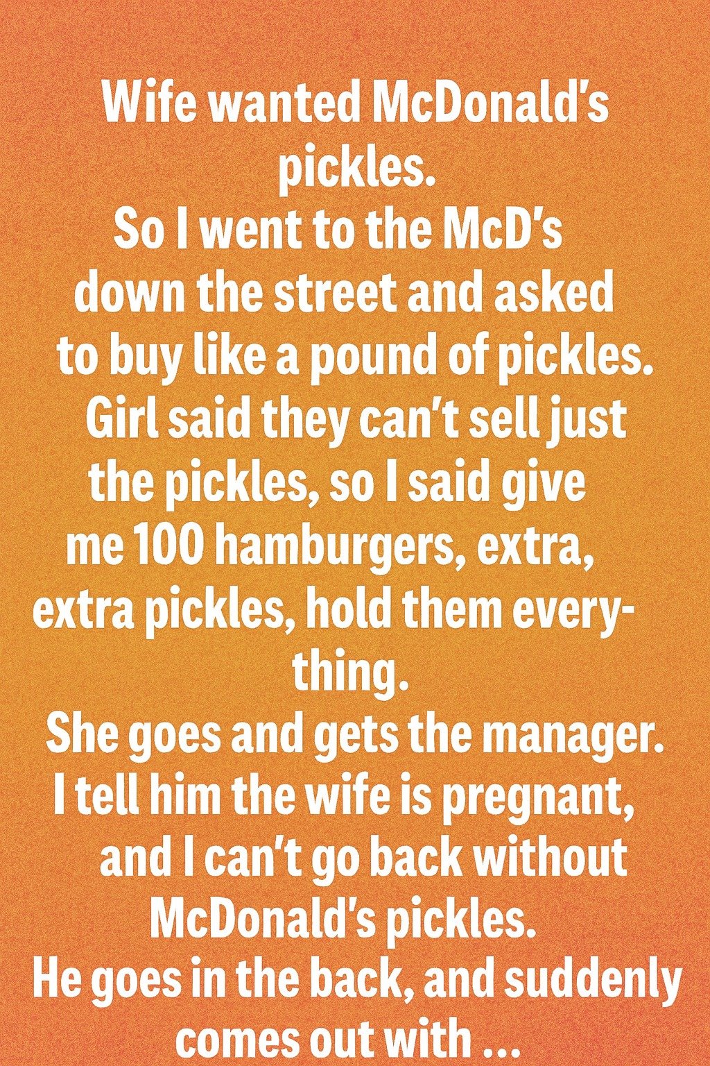 I left, feeling a mix of frustration and determination—I didn’t want to go home empty-handed. Determined to make her happy, I jokingly told the cashier, “Okay, give me 100 hamburgers with extra pickles, hold everything else.” She looked confused and went to fetch the manager. I explained the situation: “My wife is expecting, and she’s been craving McDonald’s pickles.