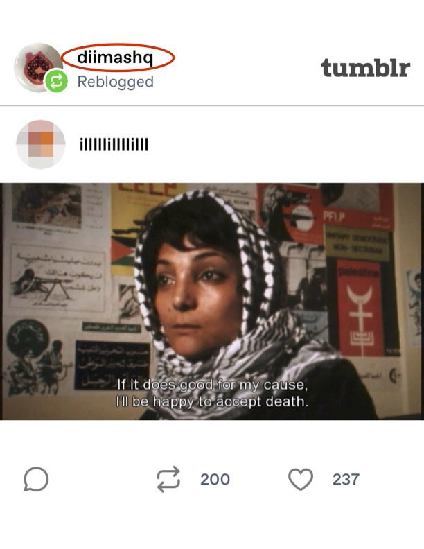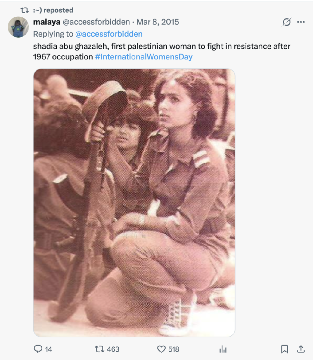 In another March 2015 post, Duwaji reposted a message praising Shadia Abu Ghazaleh, a militant who was killed in 1968 while assembling a bomb intended for use in attacks against Israeli targets. The post described Abu Ghazaleh as the “first Palestinian woman to fight in resistance after 1967 occupation” and was tagged #InternationalWomensDay.