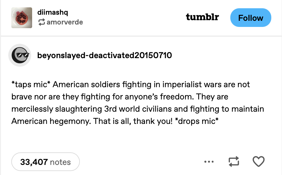 In a July 2015 repost, she shared a message stating: “American soldiers fighting in imperialist wars are not brave nor are they fighting for anyone’s freedom. They are mercilessly slaughtering 3rd world civilians and fighting to maintain American hegemony. That is all, thank you!”