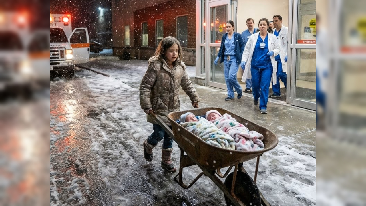 After more than eight kilometers , she arrived at the regional hospital. Her legs were trembling. She pushed the wheelbarrow to the emergency room entrance and shouted at the top of her lungs. Nurses and patients froze at the sight: an exhausted little girl, two babies purple with cold, and tears streaming down her face.