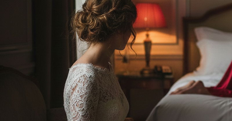 I sat at the edge of the bed, still wearing my wedding dress, waiting for him.