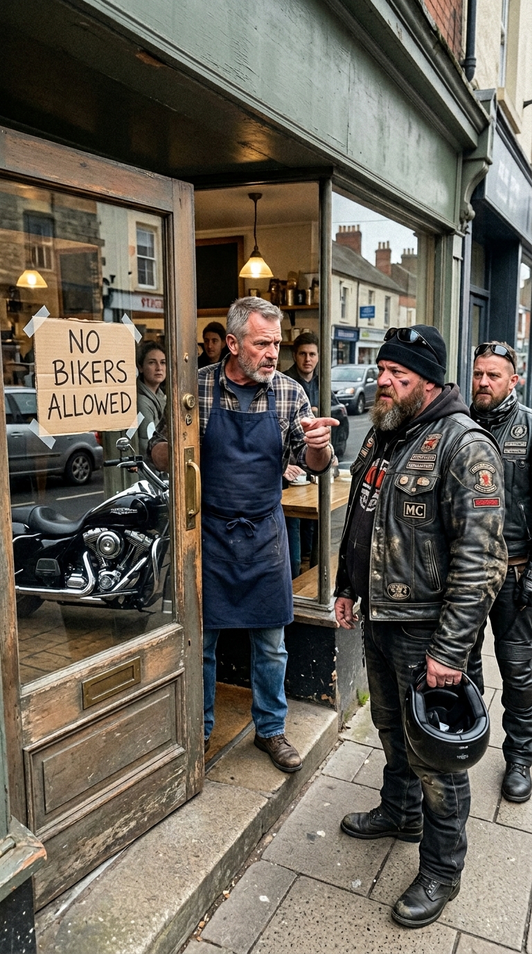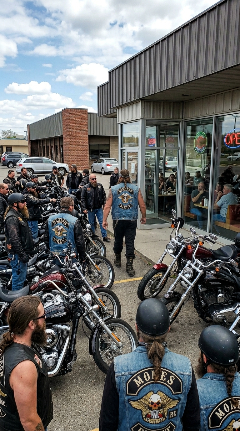 A Quiet Lunch Hour in Billings Turned Into a Scene Nobody Could Forget When a Worn Old Man Was Turned Away from the Diner, and Moments Later the Parking Lot Was Suddenly Filled with Motorcycles, the Engines Low and Steady, Leather and Sleeveless Vests Filling the Frame, Until a Tall, Broad Biker Stepped Inside, Calmly Scanning the Room, Asking ‘Where Is He?’ in a Voice That Made Everyone Pause, Leaving Patrons Shaking, Whispering, and Questioning Exactly What They Were Witnessing