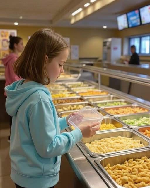 The cafeteria hummed with its usual noise—plastic trays scraping, kids laughing too loudly, the faint smell of pizza and applesauce—but one student moved through it with quiet purpose. Mia Turner, nine years old, small for her age, with chestnut hair that never quite stayed in its ponytail, was slipping leftover food into her backpack. A sandwich here. A fruit cup there. A slice of pizza wrapped carefully in a napkin.