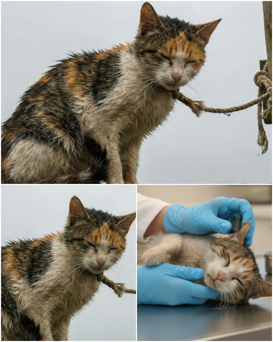 In a quiet corner of the city, where the hum of traffic blends with the whispers of the wind, a tragedy unfolded quietly but with immense cruelty. A tiny calico kitten, shivering from the cold, lay tied to a post beside a pile of trash. The rope around his fragile body was the only thing keeping him upright. His fur, soaked with rain, clung to his trembling frame, and his bright little eyes barely had the strength to open. In that moment, it seemed as if the world had turned its back on him entirely.