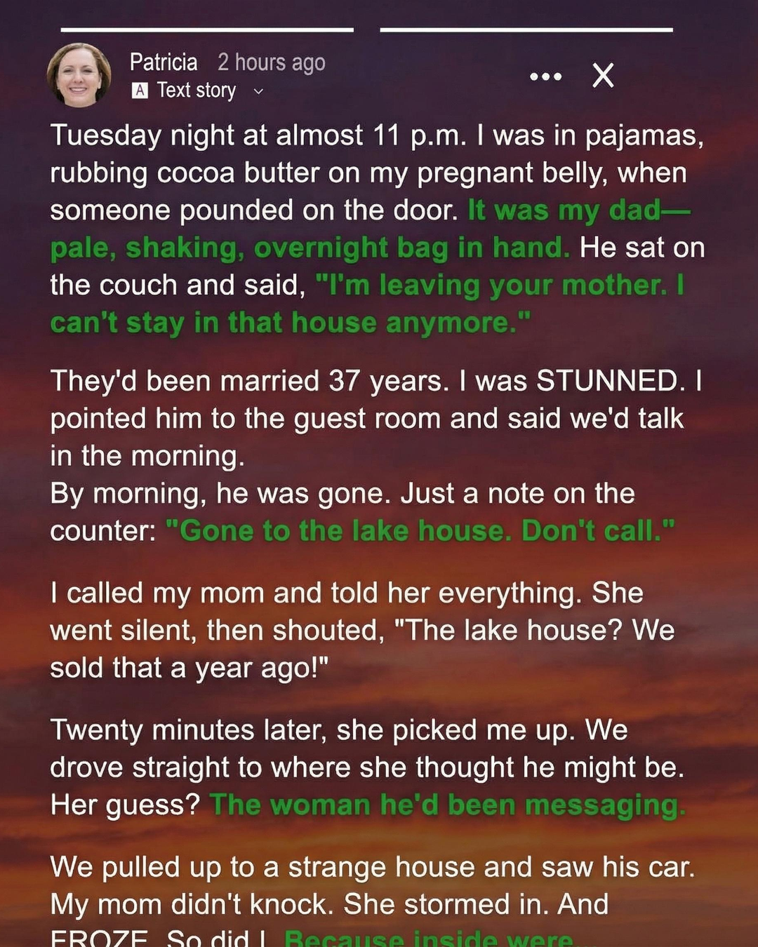 Tuesday night at almost 11 p.m. I was in pajamas, rubbing cocoa butter on my pregnant belly, when someone pounded on the door. It was my dad—pale, shaking, overnight bag in hand. He sat on the couch and said, “I’m leaving your mother. I can’t stay in that house anymore.” They’d been married 37 years. I was STUNNED. I pointed him to the guest room and said we’d talk in the morning. By morning, he was gone. Just a note on the counter: “Gone to the lake house. Don’t call.” His handwriting looked uncertain, as though he’d rushed to write the message. Something about it didn’t feel right, but I pushed the thought aside, telling myself he just needed space. Continue reading…