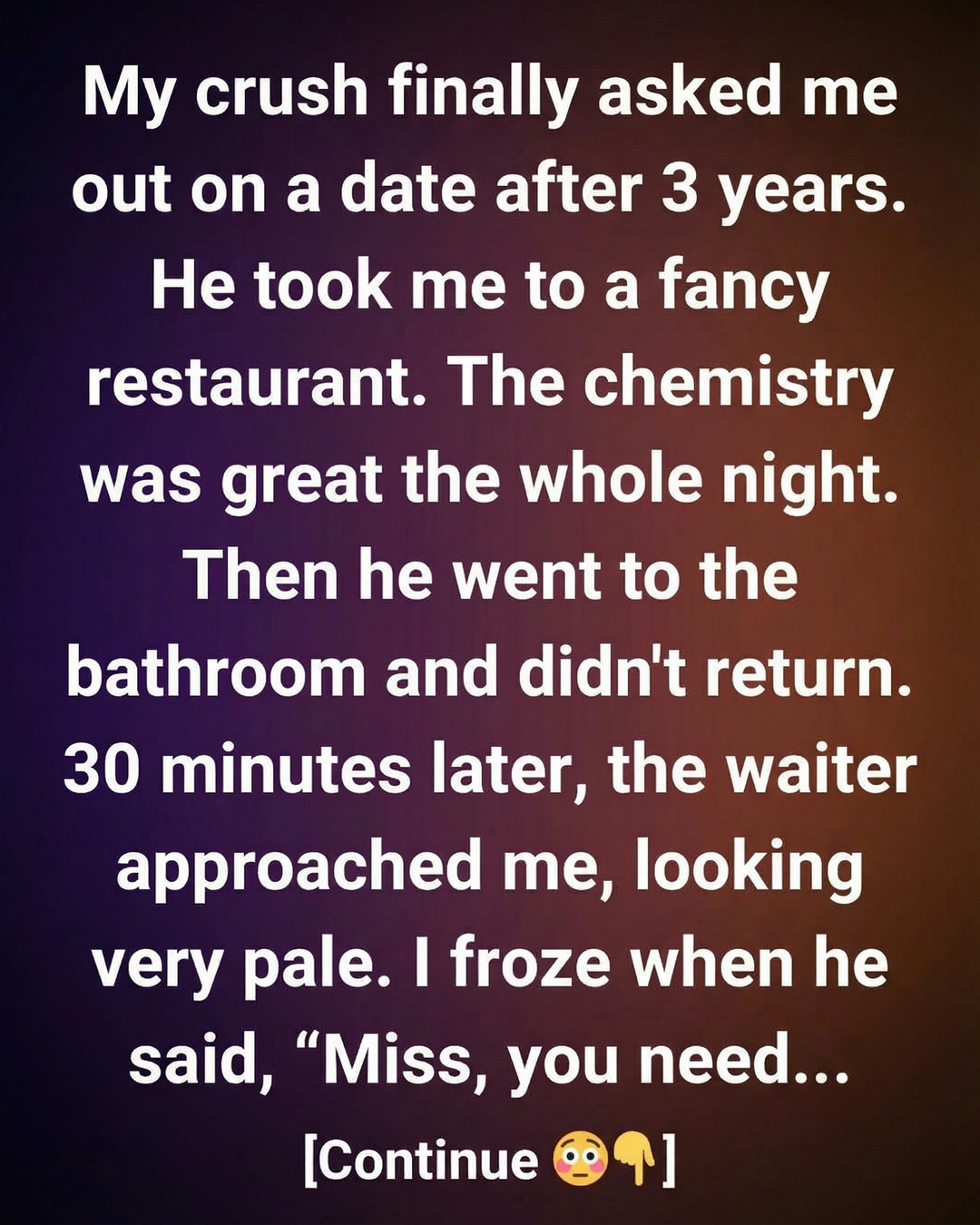 My crush finally asked me out on a date after 3 years.He took me to a fancy restaurant. The chemistry was great the whole night.Then he went to the bathroom and didn’t return. 30 minutes later, the waiter approached me, looking very pale. I froze when he said, “Miss, you need… to follow me for a moment.” My heart raced as I stood up, imagining every worst-case scenario. The waiter led me down a quiet hallway away from the main dining area. I tried to steady my breathing, unsure of what was happening or why the waiter seemed so anxious. When he finally stopped walking, he gently pushed open a door and motioned for me to step inside. At that moment, I prepared myself for an explanation I wasn’t sure I was ready to hear.