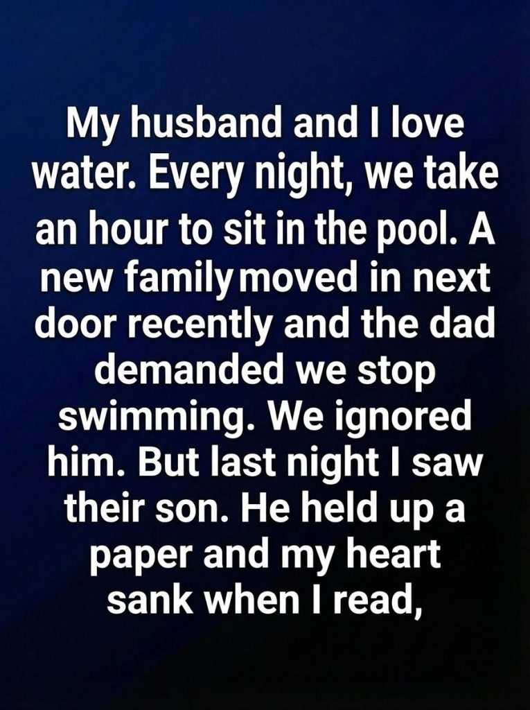 My husband and I have always loved the quiet comfort of water. Every evening, after the noise of the day faded, we spent an hour sitting in our backyard pool, talking softly and letting the gentle ripples settle our thoughts. It wasn’t about exercise or luxury—it was our ritual, a simple way to reconnect. When a new family moved in next door, we waved politely and thought little of it. A few days later, the father approached us and asked, firmly, that we stop using the pool at night. He didn’t explain much, only that it was a problem for his family. Confused but unwilling to give up our harmless routine, we chose to ignore the request and continued as before. Continue reading…