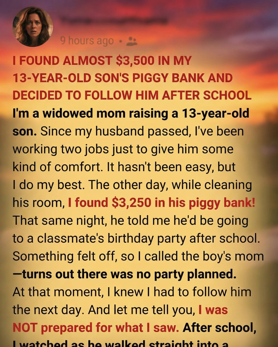 I FOUND ALMOST $3,500 IN MY 13-YEAR-OLD SON’S PIGGY BANK AND DECIDED TO FOLLOW HIM AFTER SCHOOL. As a widowed mom doing my best to raise my son alone, I was genuinely shocked when I opened his piggy bank while cleaning his room and discovered the large amount of money. For years, I’ve juggled two jobs to ensure he has a stable life, so seeing that much cash hidden away made my heart race with concern. My first thought was whether he might be involved in something unsafe or stressful for a child his age. That night, when he mentioned going to a classmate’s birthday party—one I later found out wasn’t actually happening—I felt a wave of worry wash over me. I knew I needed to understand what was going on, not to punish him, but to protect him.