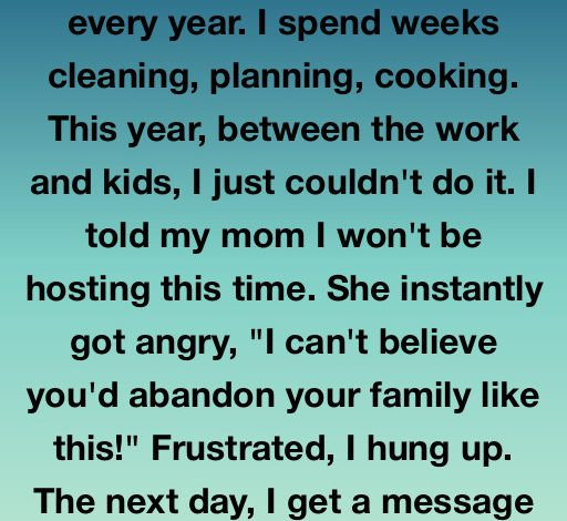 The next morning, I called Lisa first. “Your mom is not happy,” she said. “I figured,” I sighed. “I just can’t do it this year.” She paused. “Then let me handle it. I’ll host.” I blinked. “Really?” She laughed. “I’ve got the space, and honestly… it might even be fun. We can mix things up.”