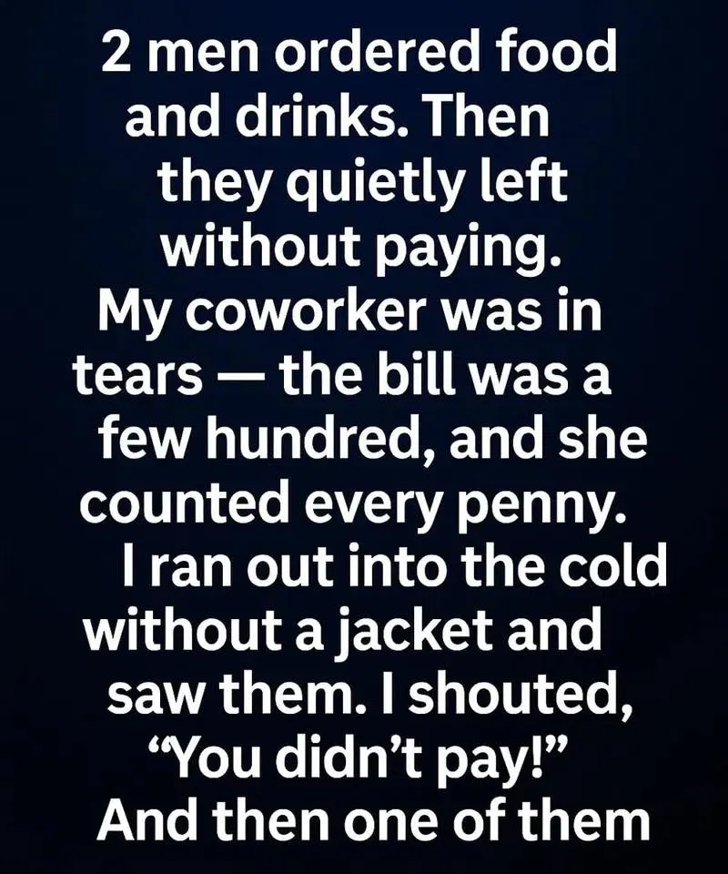 That’s exactly what happened on a cold evening in our little café when two men walked out without paying their bill. At first, it looked like nothing more than another case of people trying to take advantage. But the truth was far more complicated—and far more human.