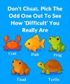 Visual puzzles that ask you to “pick the odd one out” have become wildly popular online, and for good reason—they’re quick, fun, and surprisingly revealing. While they may look like simple games, psychologists note that the way we sort objects, recognize differences, and justify our choices can highlight unique aspects of our thinking style. In today’s puzzle, you’re presented with five cartoon animals: a crab, a fish, a frog, a toad, and a turtle. At first glance, the task seems straightforward: choose the one that doesn’t quite fit. But depending on the criteria your mind instinctively uses—shape, habitat, biology, or subtle characteristics—your answer can reflect how you naturally solve problems and interpret the world around you. Before analyzing further, take a moment to pause and choose the animal that stands out most to you.