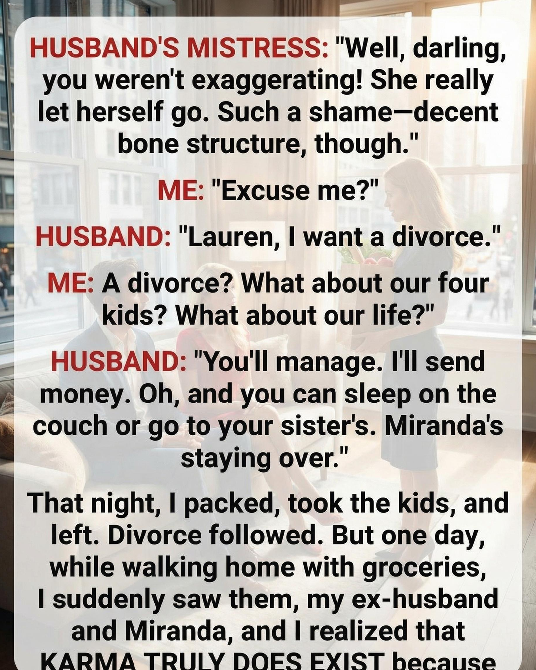 ME: “A divorce? What about our four kids? What about our life?” HUSBAND: “You’ll manage. I’ll send money. Oh, and you can sleep on the couch or go to your sister’s. Miranda’s staying over.”That night, I packed what I could, gathered the kids, and walked out of the house I had built with love and effort for over a decade. The divorce soon followed, bringing confusion, exhaustion, and fear—but also a strange clarity. I promised myself that the disrespect I experienced that day would be the last time anyone diminished my worth. In the quiet moments after the children fell asleep, I began to rebuild a version of myself that I had neglected while trying to hold together a marriage that had already crumbled. Continue reading…